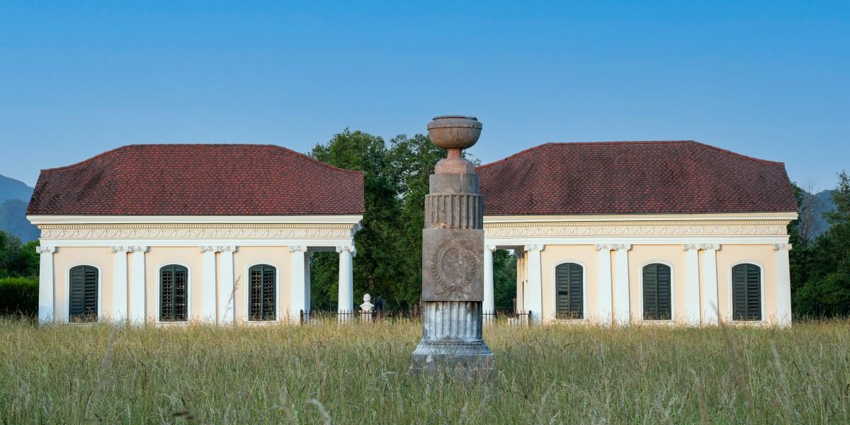 Paviljona je v letih 1827-31 sezidal beneški arhitekt Franceso Cocani. S stebričastima pročeljema si stojita nasproti, vhodni fasadi sta bogato členjeni; v nišah so postavljeni kipi štirih muz – slikarstva, arhitekture, pesništva in glasbe, ki jih je ustvaril Martin Kischner leta 1834. Tudi zunanji fasadi spominjata na antične templje. Severni paviljon (1831) je bil namenjen arhivu s knjižnico, južni in najprej zgrajeni (1822) pa likovni zbirki in muzeju – prvemu muzeju na Slovenskem.